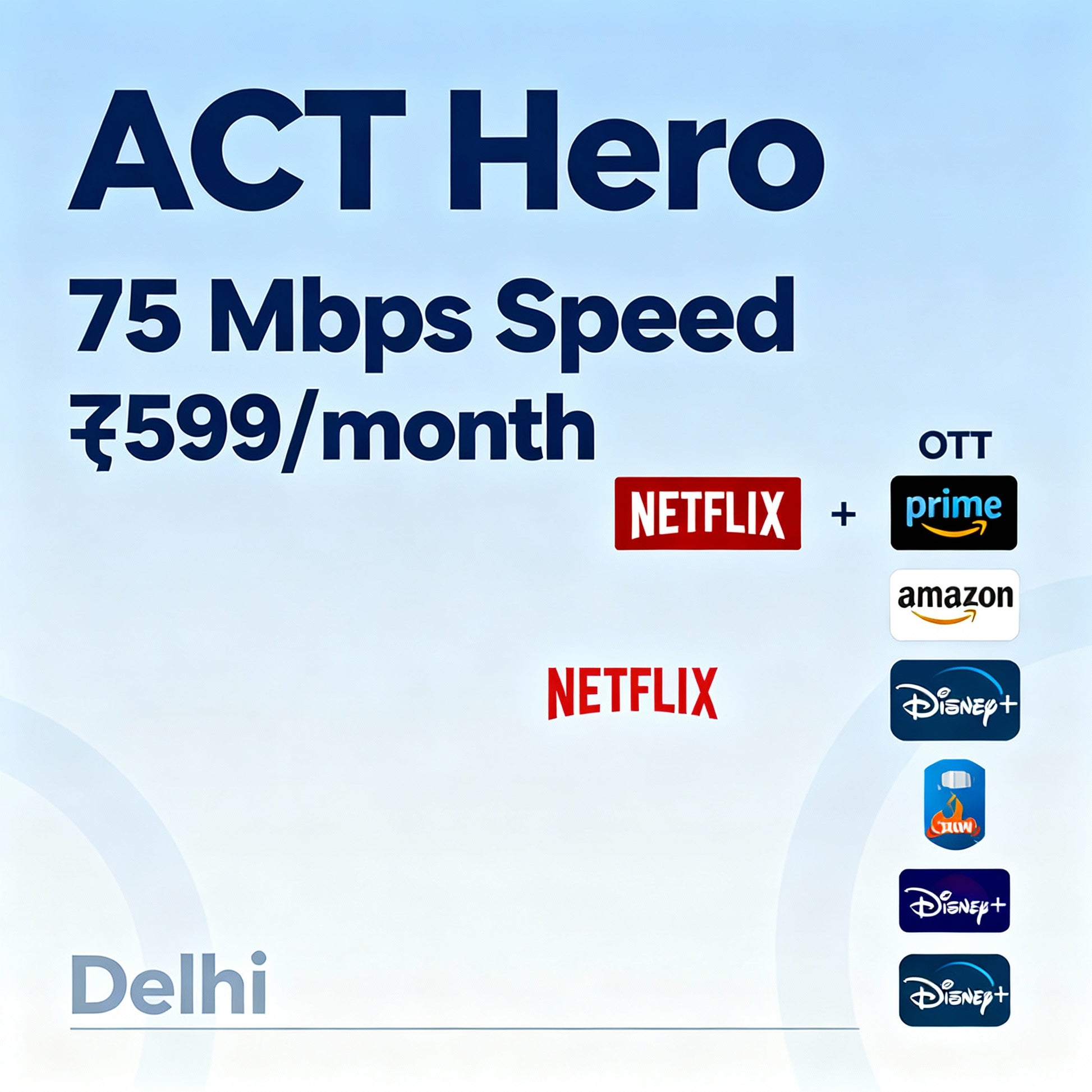 The ACT Hero plan is a broadband offering in Delhi that provides a base speed of 75 Mbps for ₹599 per month, with multiple variants like Hero Plus, Hero Prime Plus, and Hero Ultra, each including additional OTT platforms and higher speeds at incrementally higher prices.